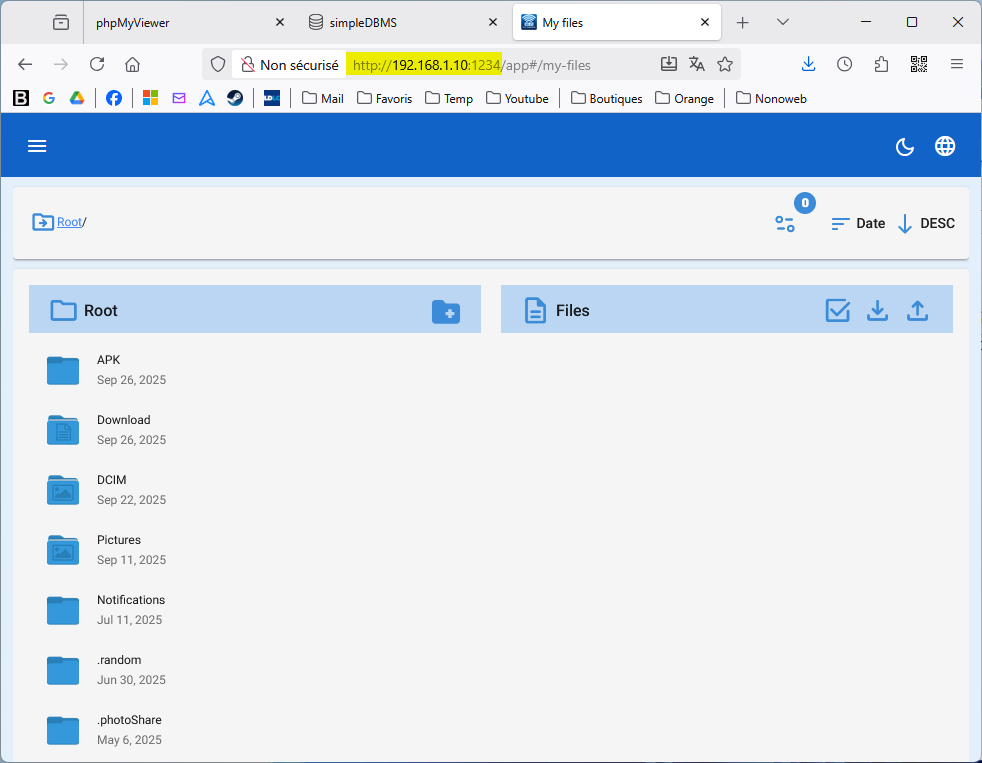 Après avoir rentré l'URL (donc l'adresse en bleu sur le smartphone), dans la barre d'adresse du navigateur. Les dossiers du smartphone s'affichent (à partir de la racine root).