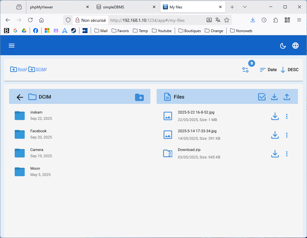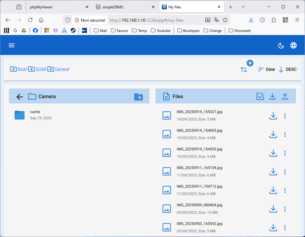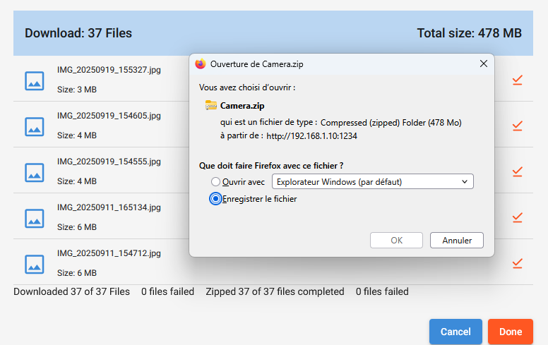 C'est bien souvent ce qu'on veut sauvegarder en priorité dans son smartphone. Donc, création d'un fichier zip avec tous les fichiers et téléchargement de cette archive zip sur le PC.