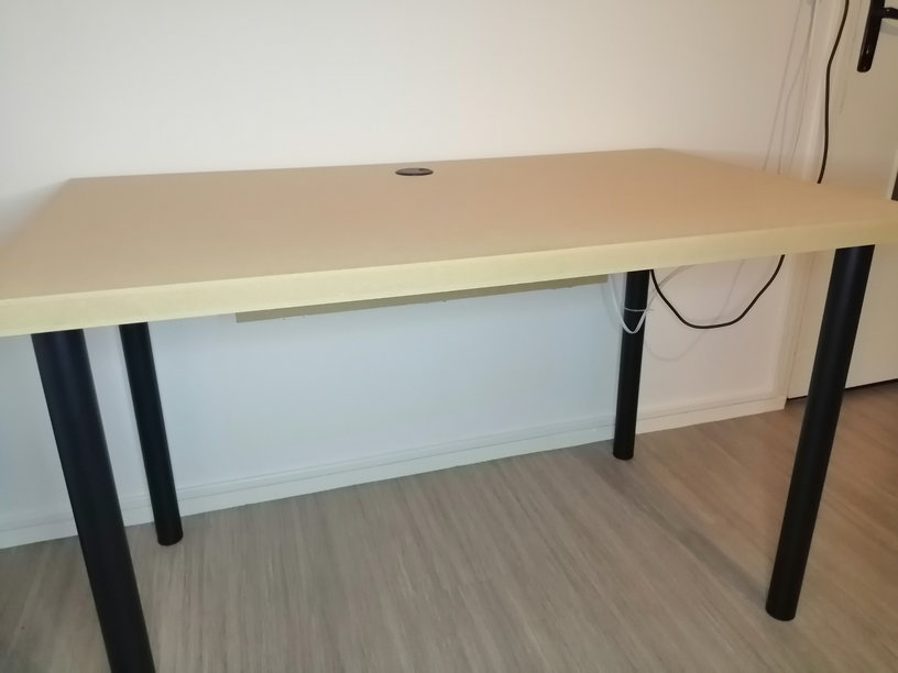 Un plateau en MDF de 35mm d'épaisseur de 120cm x 70cm et 4 pieds de table achetés chez Leroy Merlin.