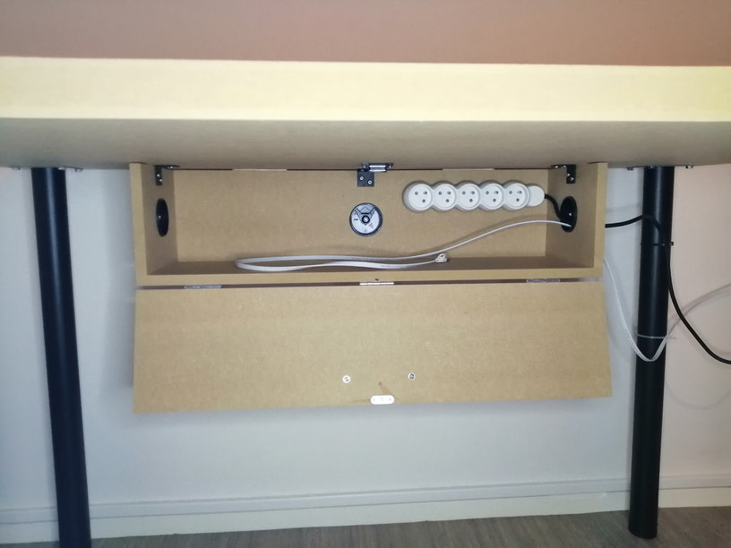Pour les câbles, une boite à câbles en dessous, aussi de ma fabrication, avec les passages de câbles qui vont bien.